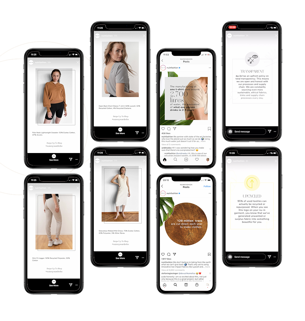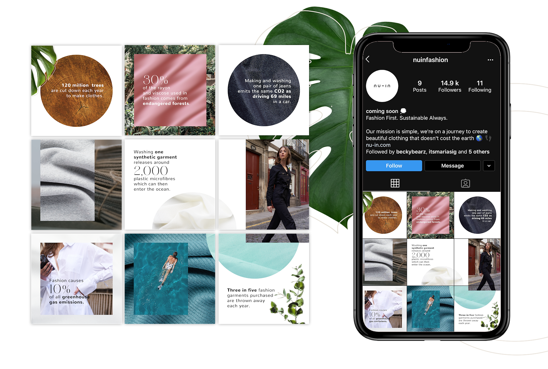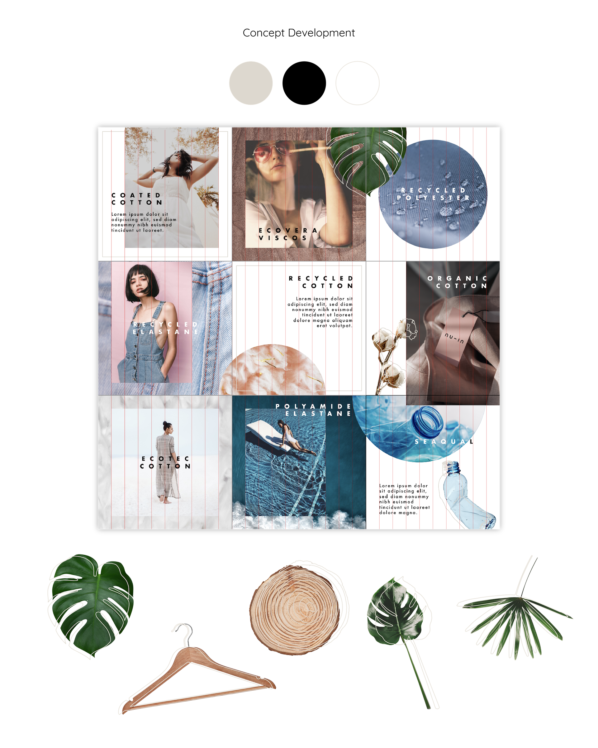 It was a 3-month+ project in which regular social media posts were created to follow the campaigns launch. Designs were in a minimalistic style featuring geometric shapes and natural subjects to reflect the brands identity: Fashion, Sustainably Driven.